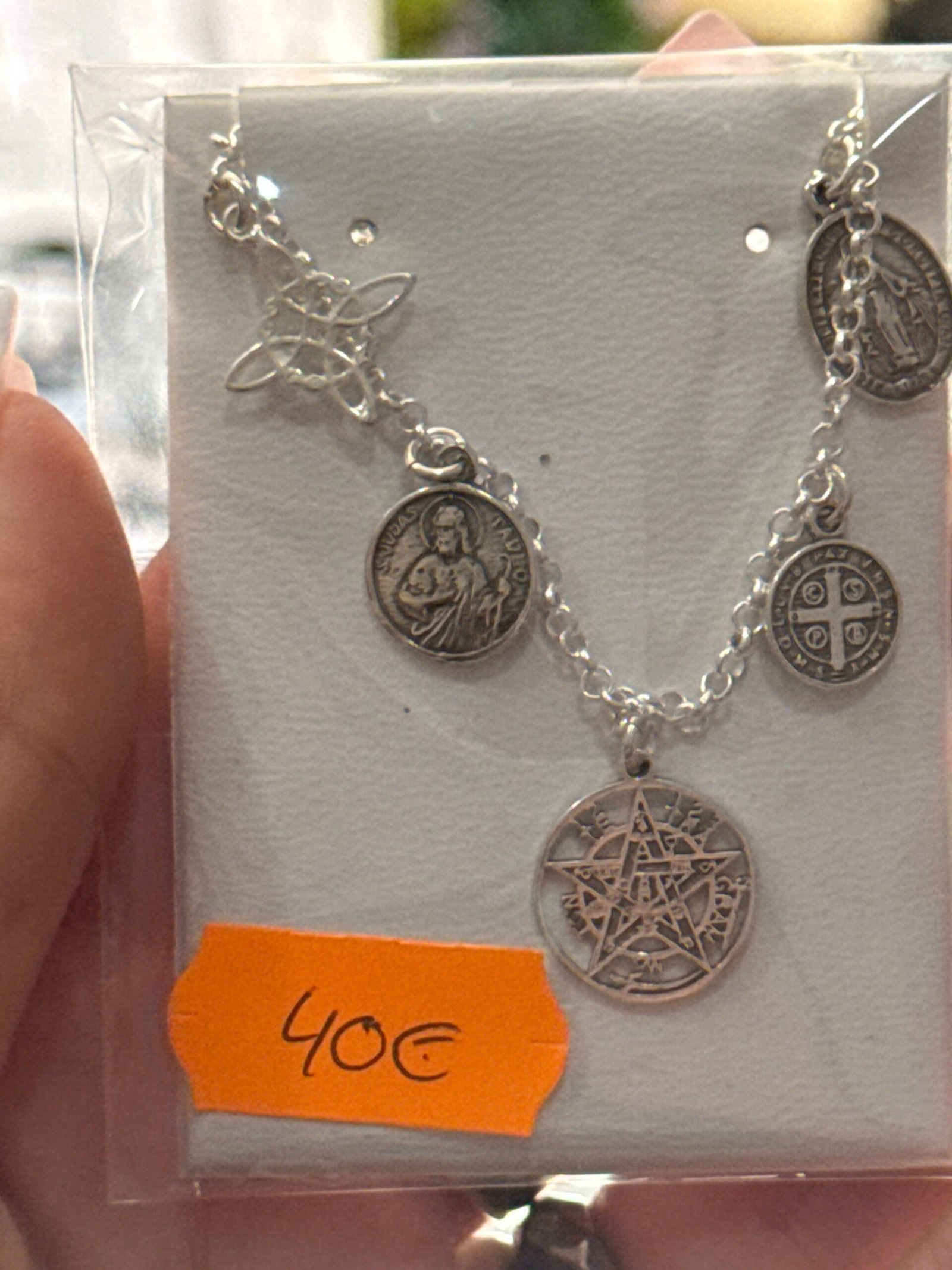 Colgante nudo de bruja, tetragramatrón, San Judas, San Benito y V.Milagrosa