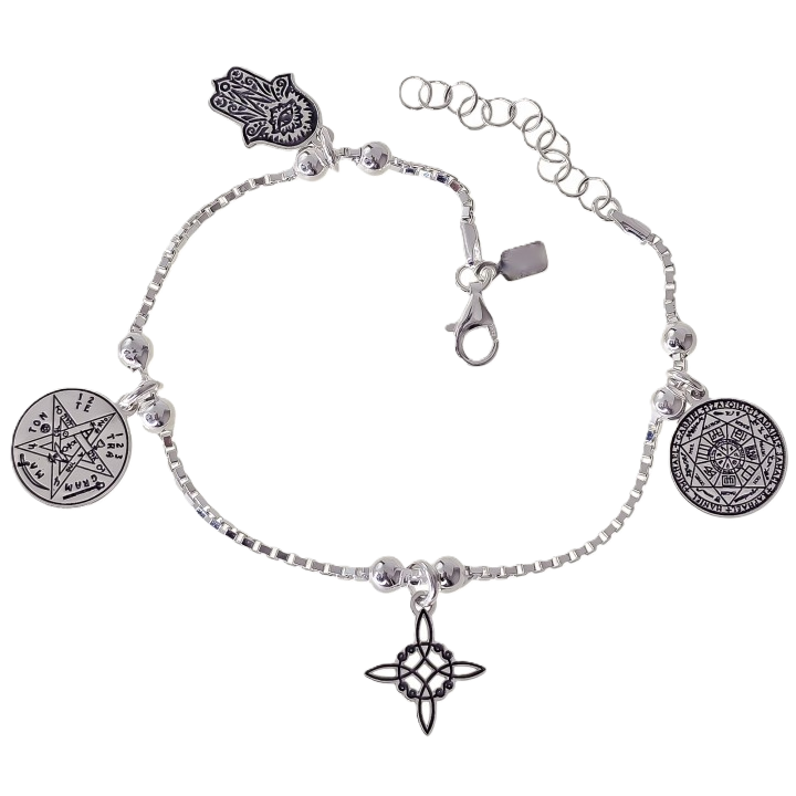 Esta pulsera de ley plata 925 combina los cuatro elementos de protección mano de Fátima, nudo de bruja, tetragramatrón, y sello de los siete arcángel.